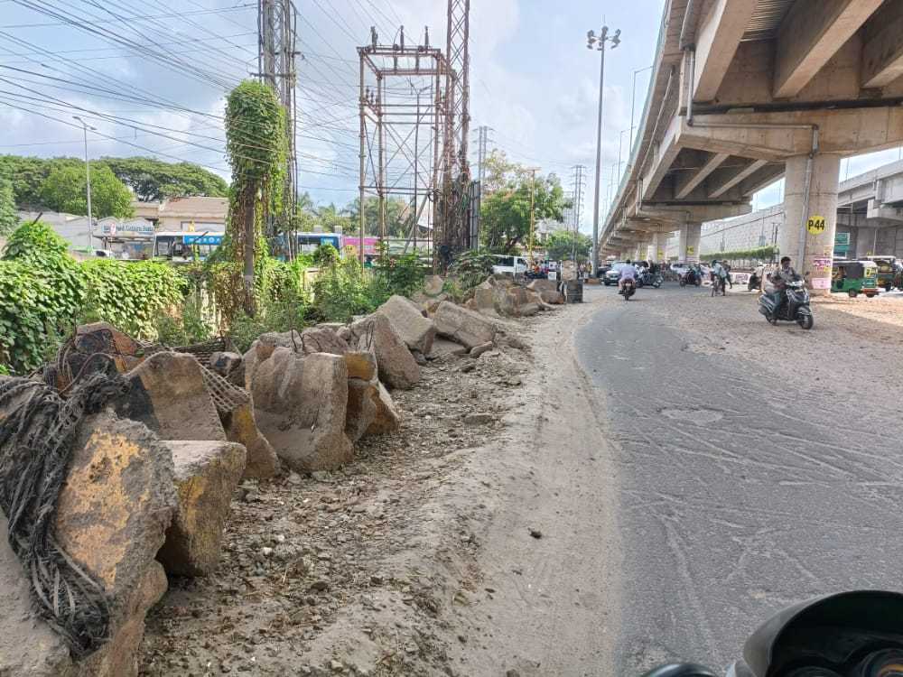 The construction waste/ damaged traffic stones are left uncleared beside the road and are becoming barriers to the vehicles. So please remove those stones as possible as you people can.