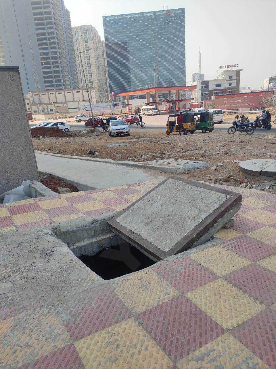 Manhole cover unclosed on the footpath on Hitech City Main Road (on the side of Aurobindo Galaxy). This is very dangerous for pedestrians.