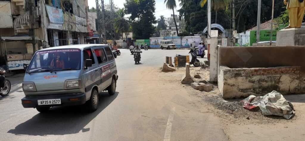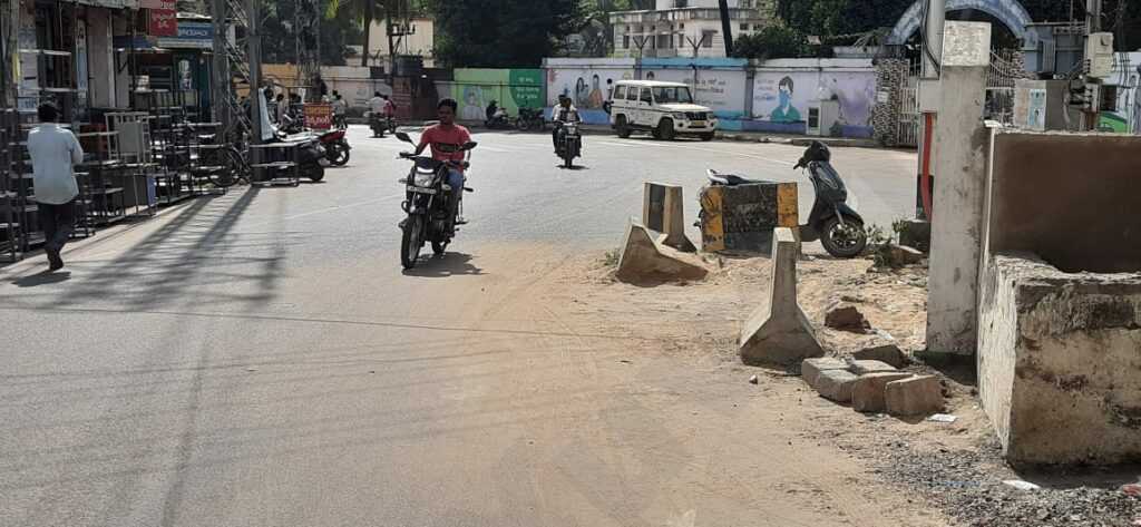 Misplaced dividers on the road near Mangala Varapu Peta at Sai Laxmi Balaji Home Needs Prakash Nagar, Rajamahendravaram.