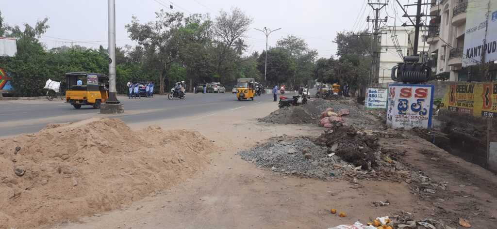The municipality of Rajahmundry is planning to extend the roads and drainage system which is good. But it should not be an obstacle to the public. The construction material is left on the roadside and due to this, many accidents are likely to happen. The municipality should remove them as soon as possible. And please provide safer and cleaner roads.